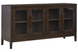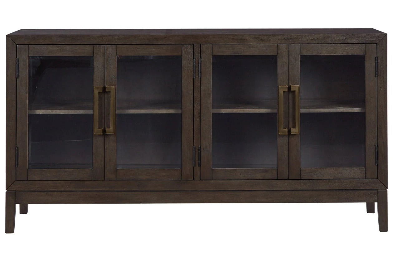 Dressed to thrill, this simply stunning dining server offers a high-design look at a down-to-earth price. Ultra sleek lines are accentuated with a dark waxy brown oak-tone finish that’s so easy on the eyes. Custom bar pulls on the double-door cabinets emphasize the server's clean, modern lines, while their brass-tone finish and metal accents in the same coloration complete the upscale aesthetic. Beautiful inside and out, glass front doors showcase the adjustable shelving to create a display and storage piece with a timeless look that's made to last. Burkhaus Dining Server to enhance the beauty of your living spaces.