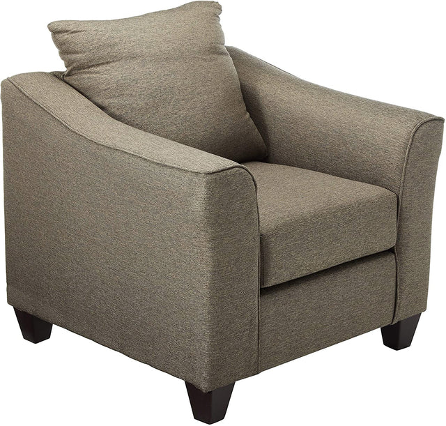 Beautifully styled, this chair fits in with a variety of seating ensembles. Flatter a contemporary space with a contoured silhouette. Flared arms add a chic touch. Wrapped in warm grey upholstery, it delivers a stylish updated palette. Make this chair a favorite venue for reading or watching TV.