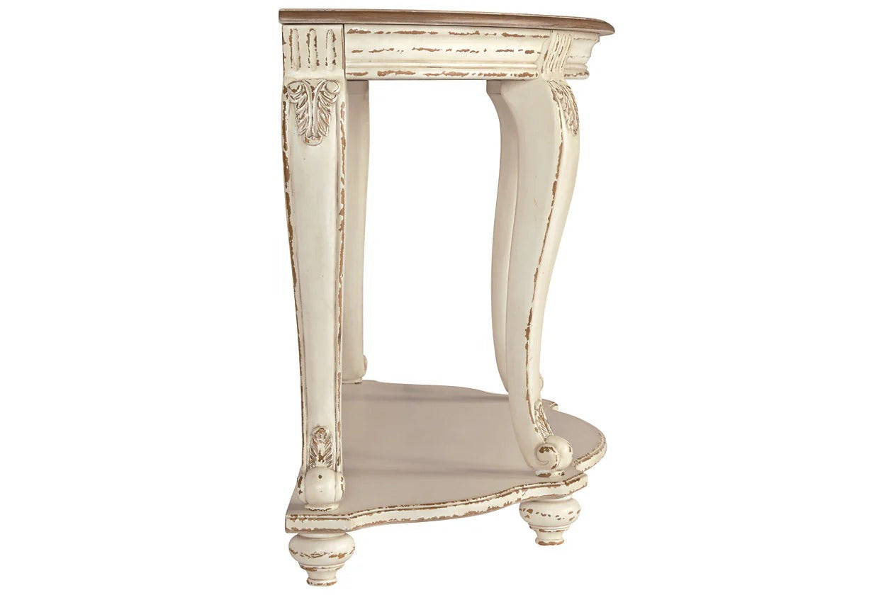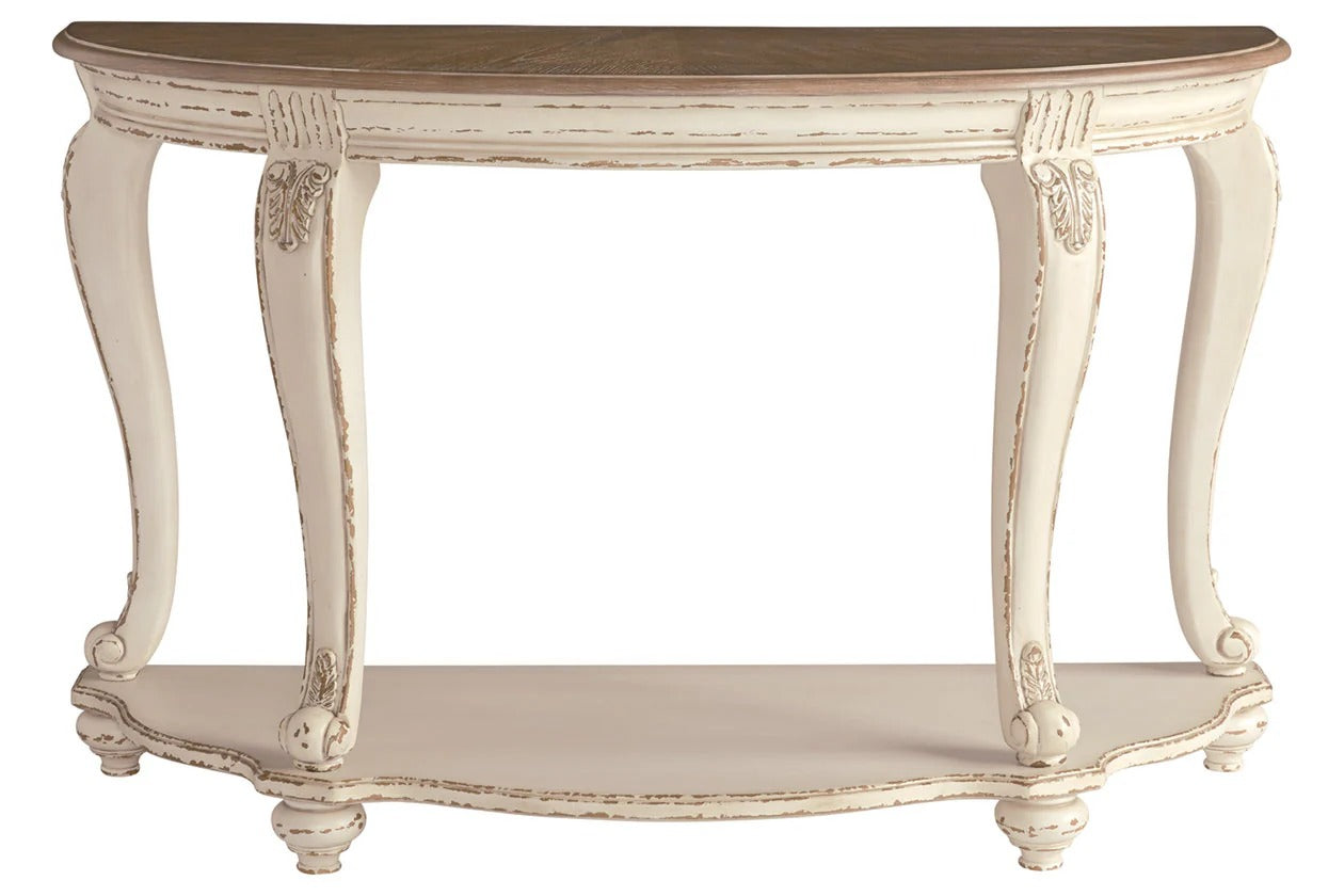 Elevating the art of traditional cottage styling, this demilune sofa table is sure to serve you beautifully for years to come. Antiqued two-tone aesthetic blends a chipped white with a distressed wood finished top for added charm. Classic cabriole legs and shapely lower shelf are a lovely twist. Decorative corbels add refinement. Realyn Sofa Table to enhance the beauty of your living spaces.