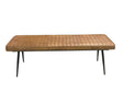 Pull up this long upholstered bench seating to a dining table or place at the foot of a bed. Perfect for an industrial style loft apartment or modern farmhouse home, this bench offers padded cushion for complete comfort and support. The foam-filled bench cushion even lends a vintage, boho-chic charm with a hand dyed goat leather fabric in a warm camel of dark espresso hues and a channel tufted design. Each end of the bench is supported by tapered and flared metal legs in a deep black finish. This bench is part of the Misty collection, which also offers matching chairs, as well as a coordinating dining table and server.