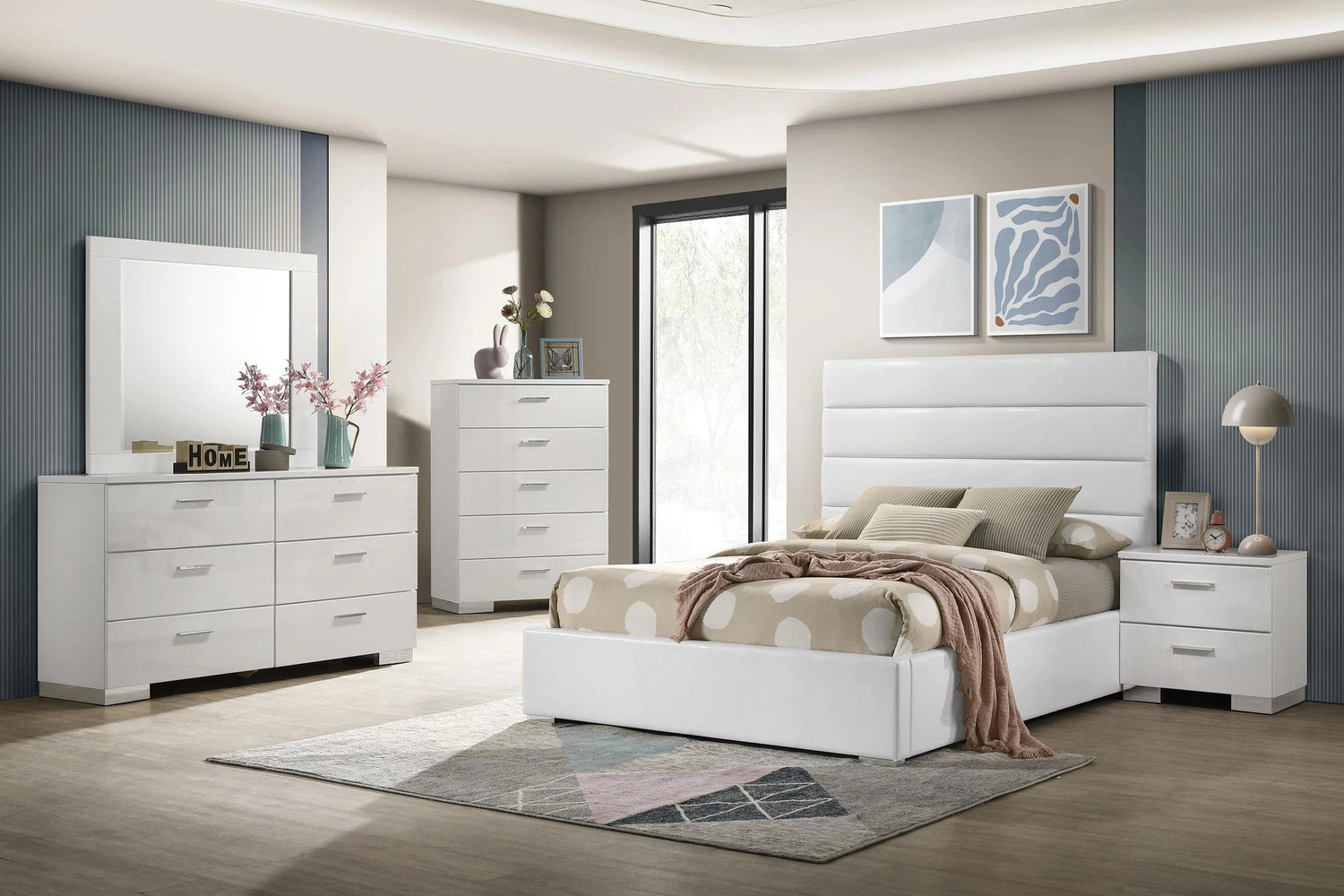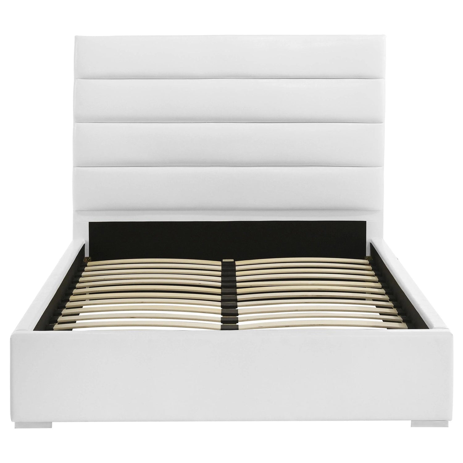 Elevate your bedroom with this modern upholstered bed featuring clean lines and a minimalist design. Wrapped in white faux leather, the panel headboard showcases horizontal channeling for a sleek and contemporary look. The sturdy frame includes slat support, eliminating the need for a box spring while ensuring mattress stability. Crafted from durable materials, this bed combines engineered wood and metal for lasting reliability. Perfect for creating a crisp, modern ambiance in any bedroom.