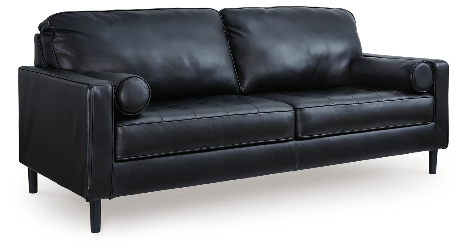 This sofa embodies timeless mid-century elegance with its linear design, sleek track arms and tapered legs. Genuine leather in the seating area adds a luxurious touch to the overall look. Experience endless style opportunities for today's living spaces. — Bryceview Sofa to enhance the beauty of your living spaces.