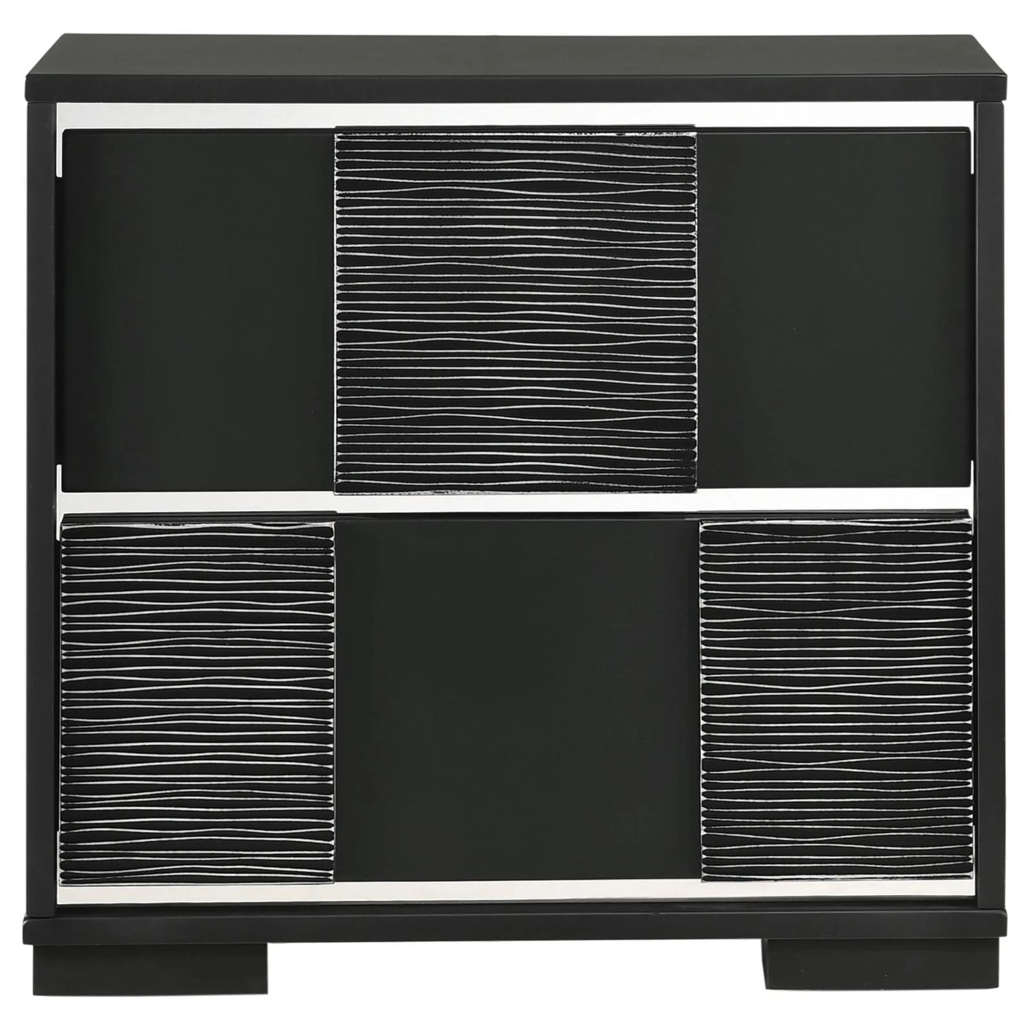 Add a dash of modern intrigue to any bedroom in your home. Crafted to catch the eye, this contemporary nightstand will add an eye-catching accent to your decor. Brushed chrome accents pop out against the rich, black finish. Chambered trim and drawer fronts round out the design with an appealing touch of visual texture. Also exceptionally versatile, this wooden nightstand offers plenty of storage space for all your bedside essentials.