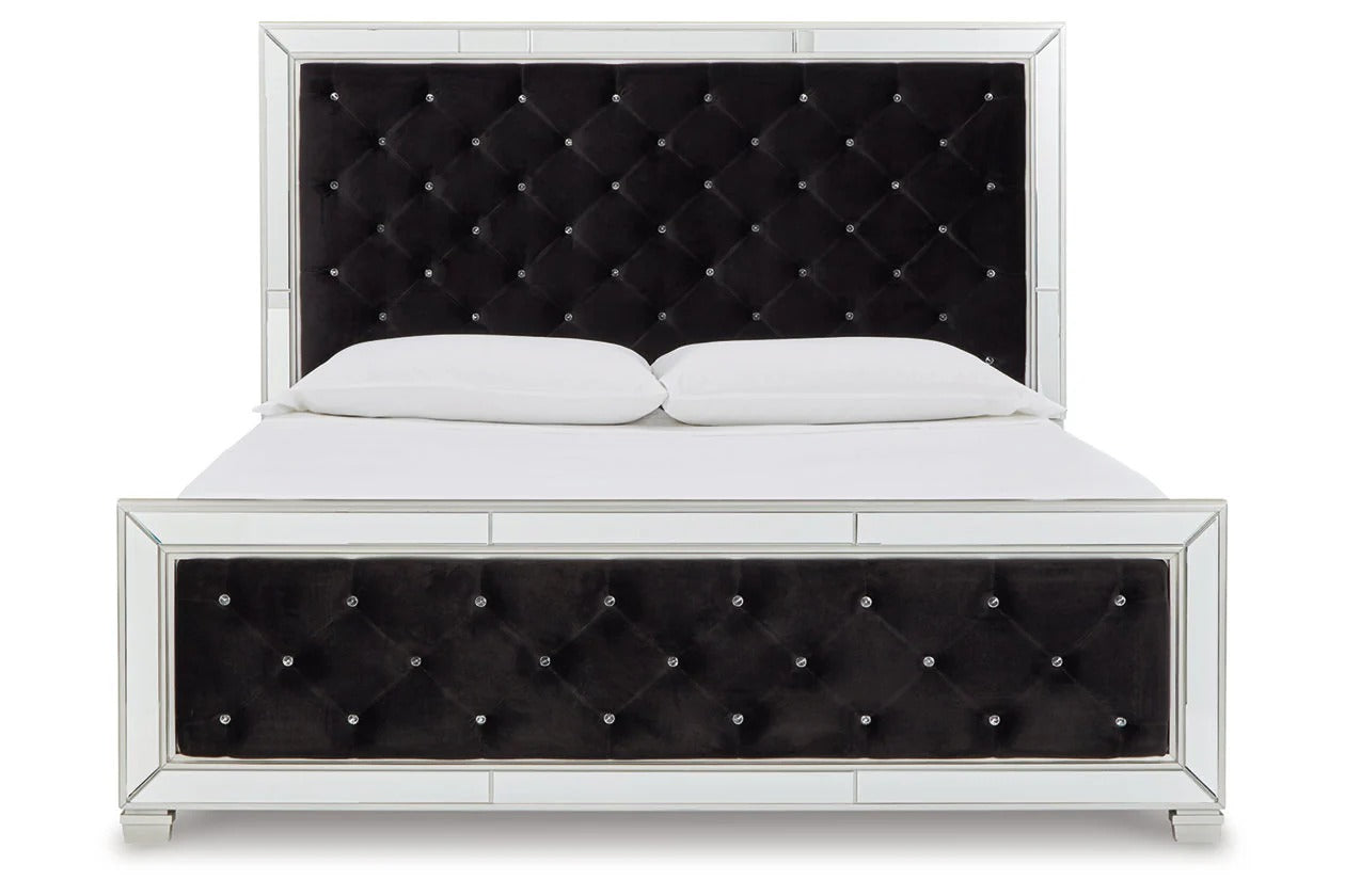 Seamlessly complete your bedroom with this striking queen upholstered bed. The dynamic piece has a cool tufted black velvet design. With faux crystal buttons on the headboard and footboard to bring the boldness, this contemporary piece effortlessly takes your room to the next level.