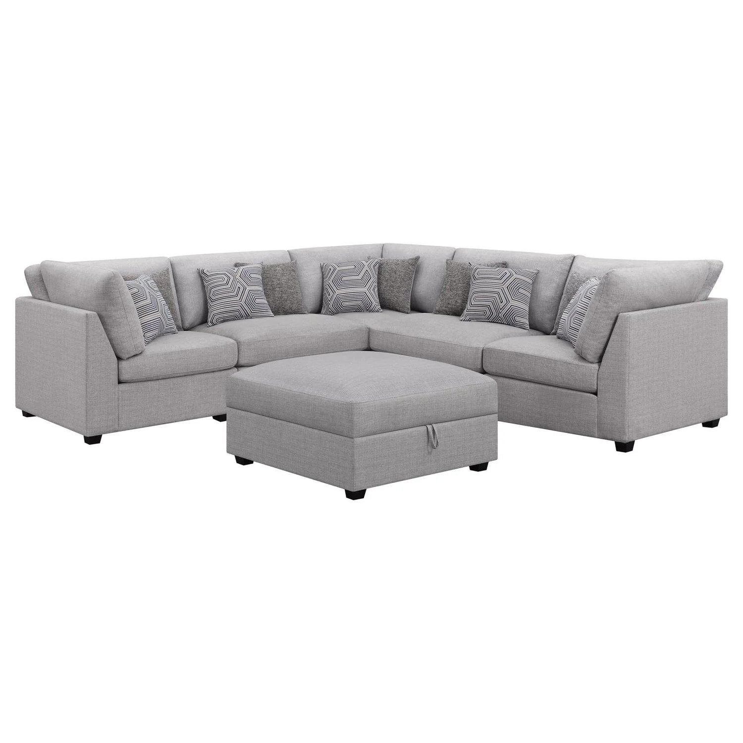 A generous modular sectional sofa delivers the perfect blend of on-trend style and impressive comfort. Designed for the whole family, the set includes a corner and four armless chairs complemented with a storage ottoman, all delivering the style and support you're looking for. Soft gray upholstery is a lovely complement to clean-lined design while smooth, tight cushions are outfitted with superior support and plush fill. The ottoman adds storage to the ensemble with a lift-top that reveals a roomy interior for all your odds and ends. Patterned accent pillows add dimension and tapered block feet provide dimension to ensure a sectional you'll love from every angle.